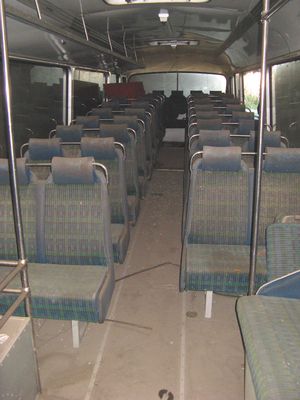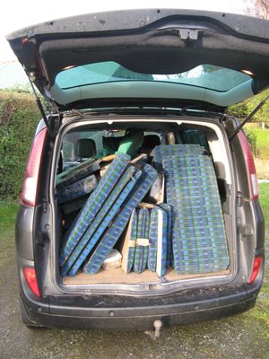 Even though the bus was tucked up in the new garage, the jobs on site were not over and some effort was necessary to keep the project moving along, and one big job that required some co-ordination was the painting of the concrete floor. I thought hard about this, having been involved (during SM106's active service life) in painting a concrete floor with a solvent-based coating, and decided instead upon an acrylic sealant of the type specified for block paving or concrete driveways. 50 litres was sourced and a long-handled, fluffy roller and the painstaking sweeping of the floor commenced. The painting was done in two stages, each comprising two coats with SM106 being shunted with a neighbour's Ferguson TE20 tractor in mid-operation. The result was better than I had expected, with a low sheen and delightful easy-sweeping action. The euphoria was rapidly dispelled when news came that the spares and "work in progress" at the old garage had been crudely pushed to one side or piled in a heap out of the way just in time to become nicely wet in the first major rainfall of the approaching Autumn. The recovery was Swift, but painful and hugely assisted by tractor-man's Bedford TK flat-bed lorry. Quite a sight, looking like a tinker's scrap collection as it made its way along the Conwy Valley loaded with seat frames, used and new bodywork and all the jigs, tools and fixings that have accumulated during the project.