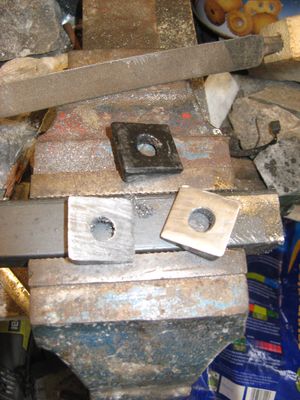 The popularity of the Great British Sewing Bee on the Beeb has a lot to answer for. Way-back in 2013 I experimented with cutting down a two-seater squab (the back of the seat) to replace the one which is missing from my second single seat. Now it was time to finish the job (I didn't cut any fabric because it is too precious), and of course I have received an Espace-full of Celestra cushions and squabs from my Fairy Godmother in Hertfordshire to re-use or cannibalise as necessary. First I had to make a new edge to the wooden board, which is curved and carries a projecting lip that locates the squab in the frame aperture. Once fettled it was set aside for glueing at home. Next I had to cut the firm edge off the Dunlopillo foam filling and re-attach it to the narrow item, soon effected with a bit of Thixofix. That was the end of work on site, as all the necessary tools were at home. The offside single squab was a very sad affair, worn, dirty and flabby, so it obviously needed refreshing too. Removing the cover revealed a disgusting mess of yellow, gritty powder which spread everywhere. Eventually I was left with a wooden back and a lot of blue tacks with tufts of moquette adhering. Budding archaeologists will realise that this is probably an original 1970s item which has never been repaired, since the ubiquitous staple-gun took over from loose tacks a long while ago. We look forward to fettling that squab in due course. At home, meanwhile, glue and clamps were applied to the wooden board of the nearside item and toes were toasted in front of our wood-stove. The following night, while swimming costumes taxed the 'sewing-bees' I performed the dreaded cuts and started to staple down the fabric. The straight edge was easy of course, but the corners had to be improvised as they could not be sewn into a curved corner per original, but folded in as neatly as possible while trimming off some weight. Much of the work will be hidden as it is on on the window side (planning, you see) or behind the cushion. Fingers crossed for the fitting! Just in case anybody is reading this, the fact that no updates have been posted for a very long time should not be taken as evidence that SM106 is in peril. Unfortunately, time is not so abundant because of various changes in the domestic situation and a requirement for more time to be spent on the family. Smaller jobs have been progressed, often at home, so that outstanding objectives can be realised. One such job required the services of Lottie the Lathe and arose because parts that were taken offsite have been lost. Nothing critical, I am pleased to say, but downright annoying just the same. Luckily, one complete set were in-situ on the bus, because they were not removed while prototyping new straps. The straps which hold the air receivers wrap around the tanks but are not U-shaped because their ends, if projected, would touch some distance away from the chassis. This entails a wedge-shaped block to be interposed between the nuts and the chassis mount to accommodate the angular mismatch. Not the easiest of parts to fabricate. The way that I went about it was to centre a short length of one-inch square steel bar in Lottie's four-jaw chuck, then face and drill the centre to a clearance fit for the 3/8 inch rod strap. The bar was transferred to a vice and a slice sawn off at the proper angle, then another at a right-angle made a pair of wedges which were cleaned-up with a file. Good, old-fashioned benchwork never tires! Then the whole operation was repeated for a second pair. That was a good morning's work.
