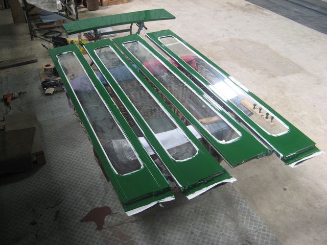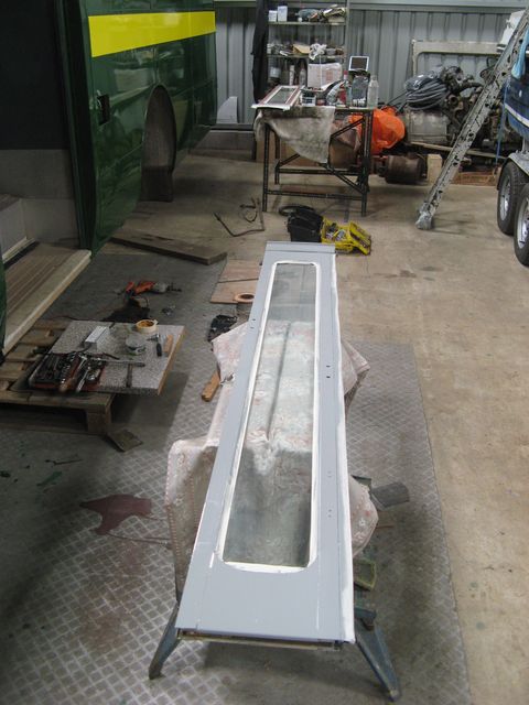 Now the problem with doors, is that as soon as you finish a task on one pair, another comes along in short order! I'll spare you the blow-by-blow account, except to say that I have decided to do the grey side, stand-clear-of-the doors side, inside side of all the leaves before flipping them over to do the green side as one batch. That way I will only need to clean my brush once, instead of twice or three times depending upon the ruling timetable. However, the entertainment during a Saturday attack on the rear pair of door-leaves was Radio 3's afternoon programme of music from the movies. The subject this week was the music of Vangelis, and it was a shock to realise that his career started before SM106 was built (was probably a greater success) and obviously went on a lot longer. The acoustics of the largely empty garage were fabulous, particularly for "La Petite Fille de la Mer" whose haunting melody I find almost entrancing. Bravo for the seventies! The shiny ceiling panels are now decidedly short of the little ventilator cover pressings, so I have started a dialogue to get them blast cleaned of all their rust, muck and old paint so that they too can be brought up to scratch for progressive reinstatement. In the meantime, short, extra sessions have focused on getting the grey coats completed because the project cannot sustain delays of many weeks while the doors are brought up to completion. I have been putting-off the attack on the front, nearside corner pillar because I have been nervous that the extra thickness of the new GRP moulding will push the line of screws too close to the edge of the wooden batten which forms the shape and strength of joint between interior and exterior panelling. Elsewhere it is done with substantial steelwork - in the exit recess, for example. PRV were quite economical with the thickness of the timber which screws onto brackets on the frame (for detail see 2006B) and the curved edges of the front panels hardly meet the centre of the wooden rail, and undoing the screws to admit the new GRP corner has allowed the panelling to open up somewhat. To set the session off to a good start I made a new rain deflector for the rear speaker grille panel. Not complex, but with curves and a bend, and just the right level of complexity that it was a satisfying task to achieve in a short time and boost the success factor. After that the final preparation was done on the deflector, and beading parts for the nearside corner so that it was all nicely dried for painting. Then, only the securing of the nearside dash-panel remained; luckily with a determined left-hand grip and some brisk work with a screwdriver saw all the parts drawn together and screws inserted. Next time it will be done with mastic ready for undercoating! Etch-primer was then applied to all the parts with a scrap of upholstery foam and left to dry. Green undercoating will be done with the exit doors shortly.