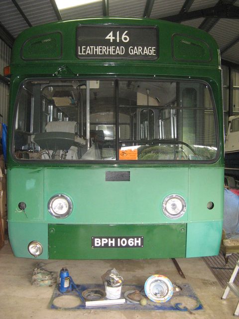 Meanwhile, on the other side of the (Gwydir) Forest the search for a proper paint-job continued, as A.A. Milne didn't say. Basically, until I have chanced my arm and applied a coat of varnish, I cannot apply the insignia and legal lettering which are in stock already, and without which SM106 isn't a proper bus. Having spent so long looking at the shiny, Lincoln Green paint, I am reluctant to spoil it. On the last day of July, I decided that the need for progress ("Fortschritt", as our late teacher of German at Hitchin Boys' Grammar School would say with great emphasis, as we stumbled along) outweighed the pretty sight of a shiny, green bus. First, Chinese Green (grey, of course) gloss was applied to all the bits that required it, then the de-mister air-intake was attached to the front dash with five pop-rivets. After lunch, out came the red Scotchbrite, as recommended by my mentor. It was a real shame to see the shine disappear after I had laboured so long to put a fine finish on the green! A bit of green repair was necessary to the beading below the yellow stripe, where the Scotchbrite had removed some green that was covering yellow that I had not masked off. After a decent interval, the green had touch-dried rapidly in the sensible warmth of the afternoon (that's why the day was chosen) and the varnishing started. My varnish was Coma Berenice by HMG, which, alarmingly, was a delicate mauve colour in the can. It did have a worrying tendency to foam on the roller, but it brushed-out beautifully and I soon got the hang of it, laying-off with a 3" brush, which was only occasionally too wide for comfort. Ashley Blackman doesn't show you how to work around corners in his YouTube videos! Focus was required, and an ideal accompaniment was the BBC Promenade concert by the Ukraine Freedom Orchestra - fabulous at any time, if you missed it. Able at last to stand back, I thought it looked quite presentable, and I was very pleased that the varnish seemed to have a lesser tendency to get in gaps and run. My worst nightmare would be that it had blistered and peeled when I go down next...... I only did the area between the doors as a trial, but it looked fine, with a smoother gloss and is certainly no worse than before. I was exhausted after that, so completed just a few little jobs before packing-up and setting off home. I had cause the other day to dig out my PhotoCD with scans of key 35mm transparencies that I used when starting this web site in the days before digital photography was the norm. The subject that I was interested in was SM128, which was displayed at the Stevenage bus garage open day during the summer of celebration for the Golden Jubilee of Green Line coach services. Back in 1980, SV's SM128 was one of a number of Swifts that were used as training vehicles. Within six months, most were disposed of to Booth's scrapyard, less than 10 years old, and more or less driveable. I often muse, as I lie in the muck beneath SM106, what a lot of very hard work would have been saved by buying one at the time, rather than 25 years later! "So it goes", as Kurt would say, with a sigh. SM128 lives on, as a zombie in the DVLA database, having enjoyed a new life as Nigel the Newsbus, and a putative caravan conversion, but long since lost to view. I was pleased to call by local AEC enthusiasts Buckleys Cranes the other morning to pick up and pay for a pair of refurbished cylinder heads with a complete gasket set which they had found among piles of 'useful' bits in their workshop. Not an opportunity that I should allow to pass unheeded, I decided, especially since the accepted wisdom is that SMS637's engine has a head fault. Thereafter, a happy morning was spent fiddling with re-instating the driver's binnacle - mounting the new horn button and preparing for the new direction indicators switch. Re-wiring for all-round flashing, hazard-warning style, meant that I didn't want to go any further before consulting the wiring diagram, especially as the left-hand repeater is permanently illuminated. Someone has re-purposed the wire, I think, but at least it shows the bulb works. The indicators switch has also been re-wired so that the central lens flashes as a repeater, which is how Lucas intended it! It came to me as I looked at it, that the binnacle was crooked, so I had a go at loosening the nuts on the fixing U-bolt and giving it a twist. It looks much better now, and I expect it will be easier to drive straight in future. The other elephant in the garage these days is the new radiator, which needs drilling so that the fan motor can be mounted. I was reluctant to dive in without understanding more about the routing of hydraulic hoses, so I spent a grubby hour trying to make sense of the pipework which is still in-situ. The gist of it was that I have a complete set of 'return' pipes and reservoir, but no 'pressure' pipes at all. With luck I shall be able to view a working vehicle to see how it should be arranged. That reminded me that I had a bag at home which contains spoils from the dismantling of MBS541, its principal contents being hydraulic hoses. What I discovered when I opened it was beyond my imagining: the hoses, yes, but also a set of 5 fan blades. Even though two were damaged it meant that I had enough to replace 106's broken blade and still have a couple of spares. From time to time I have good reason to give thanks to my father for his engineering nous, recognition and aquisition of parts which had a useful smell about them!