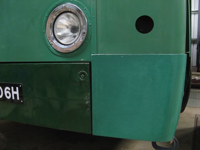 For some unfathomable reason, whenever I try to buy thin metal sheet I am given whatever the supplier has to hand rather than what I asked for. "So it goes". My neatly cut strips one inch wide were lovely, but 1.5mm thick, not 1.2mm, and proved too thick to bend easily to make my new clips for the chassis wiring in its flexible sleeving. Another supplier, asked to cut strips to my requirement simply declined to reply. Another said that it was actually quite difficult to cut thin steel sheet on their guillotine, and then clinched it by saying they couldn't cut anything that narrow anyway. In desperation I purchased a sheet 8 inches square by 1.2mm (my caliper said 1.1mm, which was actually better) through a well-known Web site and set to with my hacksaw. The first strip was a success, and bent quite easily. Thereafter it was just a pleasant, if challenging mental exercise to replicate the bends of an original clip in new metal. A couple had rusted away to nothing, one was capable of salvage and others broke while trying to remove them from the sleeved cables. I always say that there is no shame in old-fashioned benchwork, so hacksaw, hammer, plane and drill brace were applied with vigour, as shown above, to produce a very passable clip. The next ones will be better! All this positivity was only enhanced by having received an updated V5C stating that BPH 106H is now taxed as an HISTORIC VEHICLE, or CERBYD HANESODDOL on the flip-side, Welsh-side. Progress! Earlier there was a picture of the preparation and painting of the grey side of the exit doors, and my determination was to crack-on and deal with the green, livery side in one batch. The other point was that both green undercoat and Lincoln Green gloss had applications in other areas, and they needed preparing in advance of the tin opening. Trimming, drilling, countersinking and screwing the beading over the front dash and lower corners thus became the order of the day, and I am pleased to say it all went well and at the end of a busy day I had inserted 47 screws and undercoated the exit doors AND the entire front dash panel! I thought to myself that moving on to my last tube of non-setting mastic no longer implied that it was time for replenishing the supply, and I enjoyed that feeling as I drove home. The recommendation by Kevin from Wythall of ultra-fine Scotchbrite also turned out well, so the very old paintwork which was to be given a fresh undercoat was clean and smooth for its fresh paint. Masking-up all the four door leaves took a while, of course, and I did not want to repeat the exercise, nor did I want the paint to go really hard, so undercoat and two top-coats were done on succeeding days over one long weekend. Peeling off the tape was a real joy, and the paintwork looked just fine - done entirely with a one-inch synthetic brush. With the doors lying flat a fairly generous coat can be applied, which under ideal conditions flows out wonderfully to leave almost a mirror finish. I also did the towing hatch, which was done for a joke a long while ago, and not well-prepared. The part is so battered thare is no point in going too far, but fixing the chips on the corners will make it look much better, although the slim brush was too small for a good finish on such a big area.