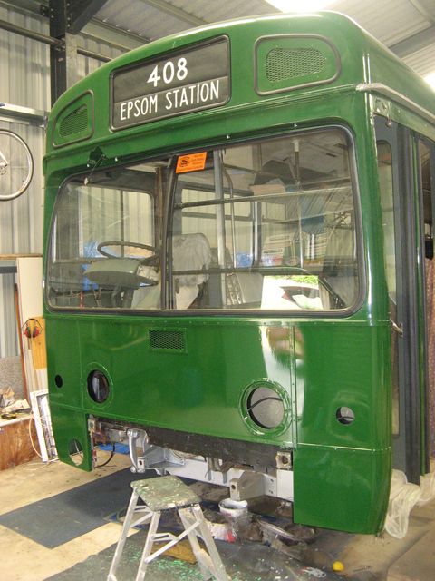 In the end, it took three attempts to get the front dash varnish right, but it now looks very "acceptable" and ready for its vinyl decorations. Various bits of trim were given primer and undercoat ready for final assembly, and a trial fitting of the brake valve looked very positive. The valve was returned to base for attention to fitting all the plugs and adaptors which were removed during the remanufacturing process. A couple of days elapsed (due to requirement for decorating services to be applied elsewhere) before I was able to carry on, the first task being to drill the fixing holes for the nearside wiper motor. I had avoided this in order to reduce the number of dribble-inducing, paintbrush-interrupting discontinuities while painting the front dash, but in the end it only took about 20 minutes with a large drill to register the pop-mark to initiate drilling through with a series of increasing bit-diameters utilising my father's big machine. My own will not hold a ½" bit! A trial fitting was made from the front because of the length of the two securing screws. I had done some homework before setting out, so that I had a clear idea of where to place the vinyl decorations. Ironically, it was a fabulous shot by Steve Fennell of SM479 and Green Line RF173 at Amersham Garage which gave the necessary overview, though Barry Lejeune's equally iconic image of SM143 (how did he manage so successfully to create a fusion of candid street-photography and bus-related documentary?) was equally useful. Both images from London Country by Akehurst and Stewart, second edition 2001. The bottom of the 'wings' of the 'flying-polo' runs along the centre-line of the light-fittings, while 'PAYE' starts at the centre-line of the de-mister air inlet. Not a difficult formula to follow, which is important, of course. On the real thing, the dimensions were 'polo' 6" above the bottom moulding, 'PAYE' 3½" below the upper moulding. I won't bore you with the details, but it worked out OK after a bit of an issue with the 'Exact fare, please' lettering sticking to the backing, but I managed to avoid significant bubbles in the big, central 'London' disc which I was particularly worried about. I had lunch and sat in awe at what I had created. How can a bit of vinyl transform the appearance so greatly?