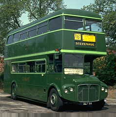RMC4 was one of the pre-production prototype Routemasters built in 1957. Coach versions differed from the standard bus in having rear air-suspension, semi-automatic transmission, luggage racks, fluorescent lighting, platform doors and more comfortable seating. RMC4 spent some time operating from Stevenage on the 716 service, both in its prototype guise and subsequently after modification to standard specification. It is seen at Stevenage Garage open day for the Green Line Golden Jubilee, 1981. It retired from active service in 1979, but has been a cherished member of the fleet of LCBS, London and Country, and latterly of Arriva, ever since.